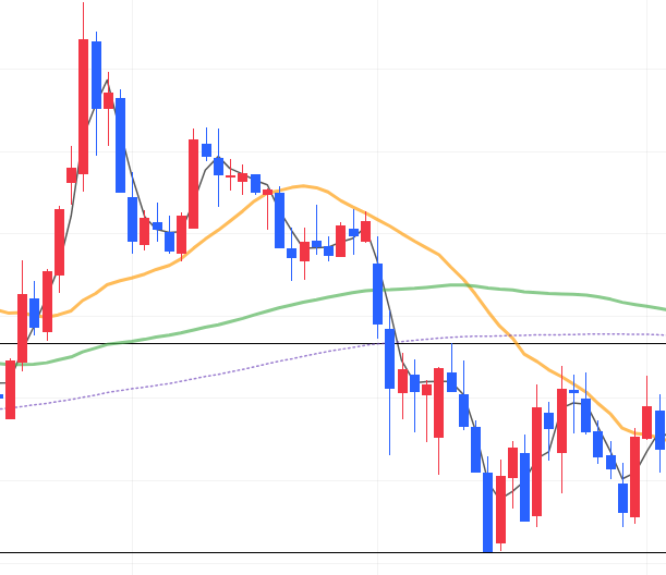 - 大きな流れは売り、最近は停滞レンジ内(黒線)