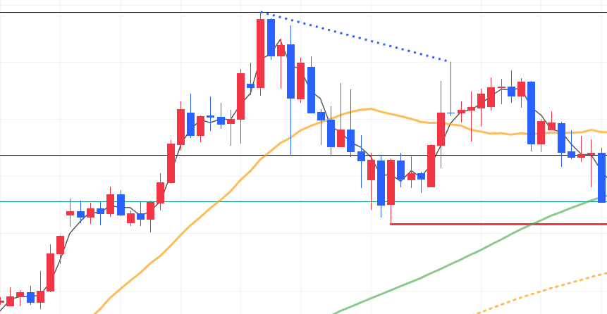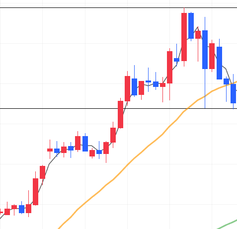 - 赤線の安値を越えられる気がせず、手前の緑線で利食い
